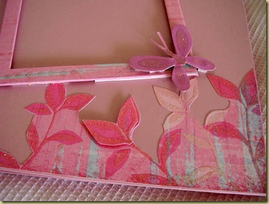 Todo forrado com um papel italiano rosa bebê, decorado com papel de scrap floral com gliter, uma moldura grande para uma foto 13x18, estrelinhas de pérola na moldura, e o nome dela acima.